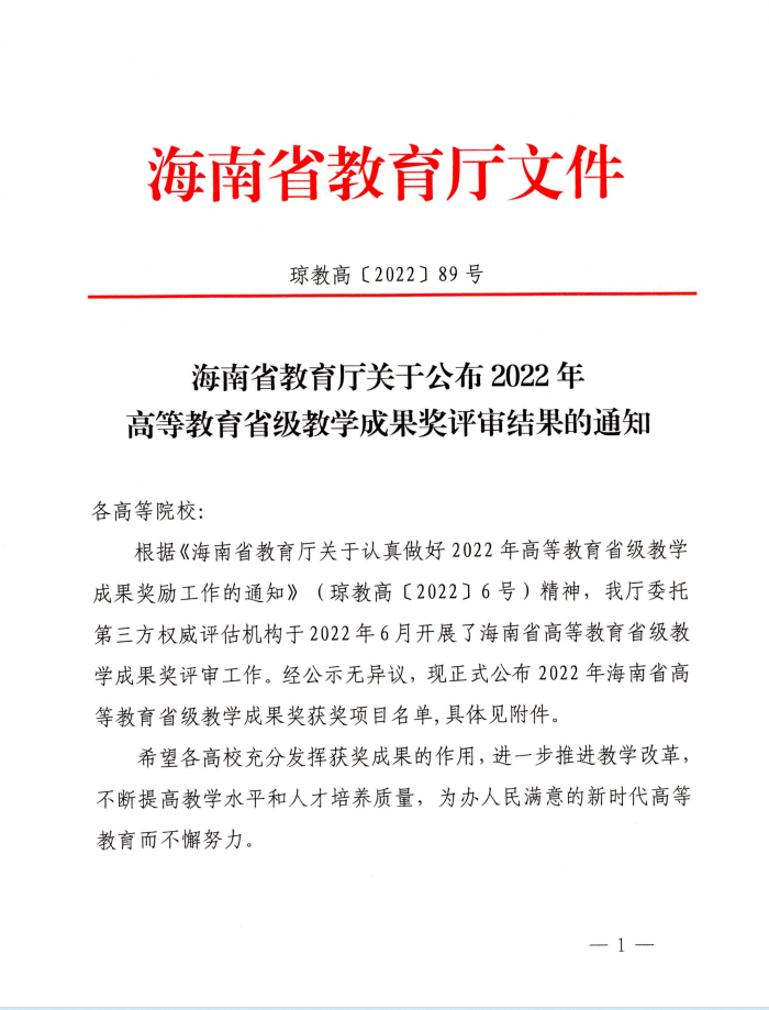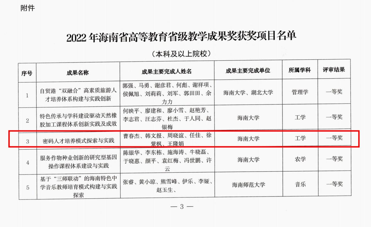 近日,海南省教育厅公布了2022年高等教育省级教学成果奖评审结果,公司《密码人才培养模式探索与实践》项目荣获省级教学成果奖(本科及以上院校组)一等奖,完成人:曹春杰、韩文报、周晓谊、任佳、徐紫枫、王隆娟等。