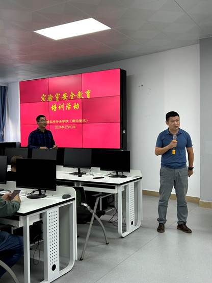 为了加强实验室安全管理,增强公司师生实验室安全意识,有效提升应急操作技能,提高风险防范和应急处置能力,根据公司实验室设备管理处《关于组织开展实验室安全教育培训活动的通知》(海大实〔2024)50号)要求,公司于12月3日下午举办实验室安全教育培训活动。公司分管副经理张殿,网络空间安全系主任徐紫枫,数据科学与大数据技术系主任李益红,综合办公室主任朱瑛,各实验室负责人、安全员、新进老师、以及部分研究生共约60人参加培训活动。活动由实验教学中心主任谭毓银主持。