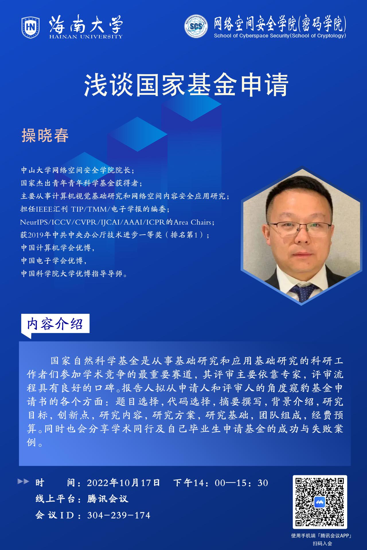 讲座内容:国家自然科学基金是从事基础研究和应用基础研究的科研工作者们参加学术竞争的最重要赛道,其评审主要依靠专家,评审流程具有良好的口碑。报告人拟从申请人和评审人的角度窥豹基金申请书的各个方面:题目选择,代码选择,摘要撰写,背景介绍,研究目标,创新点,研究内容,研究方案,研究基础,团队组成,经费预算。同时也会分享学术同行及自己毕业生申请基金的成功与失败案例。