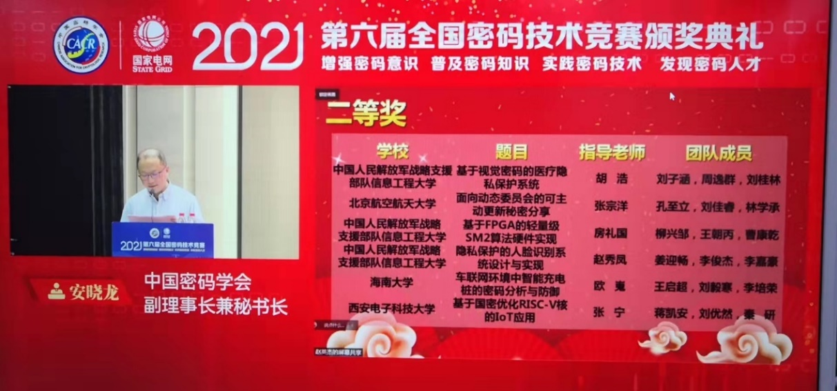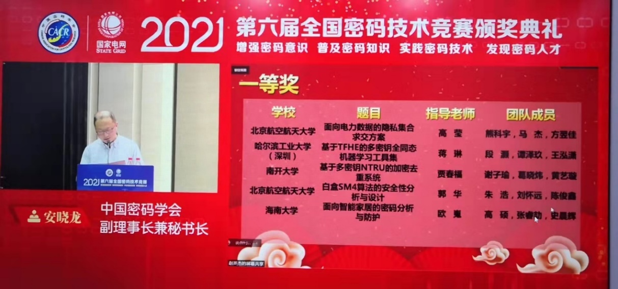 本次决赛评审和颁奖典礼采取线上线下相结合的形式,国家密码管理局正局级督察员于传斌、中国工程院院士蔡吉人、MK体育院士王小云、国家电网有限公司互联网部副主任樊涛、中国电科院董事长(经理)赵鹏等现场参加了颁奖典礼。