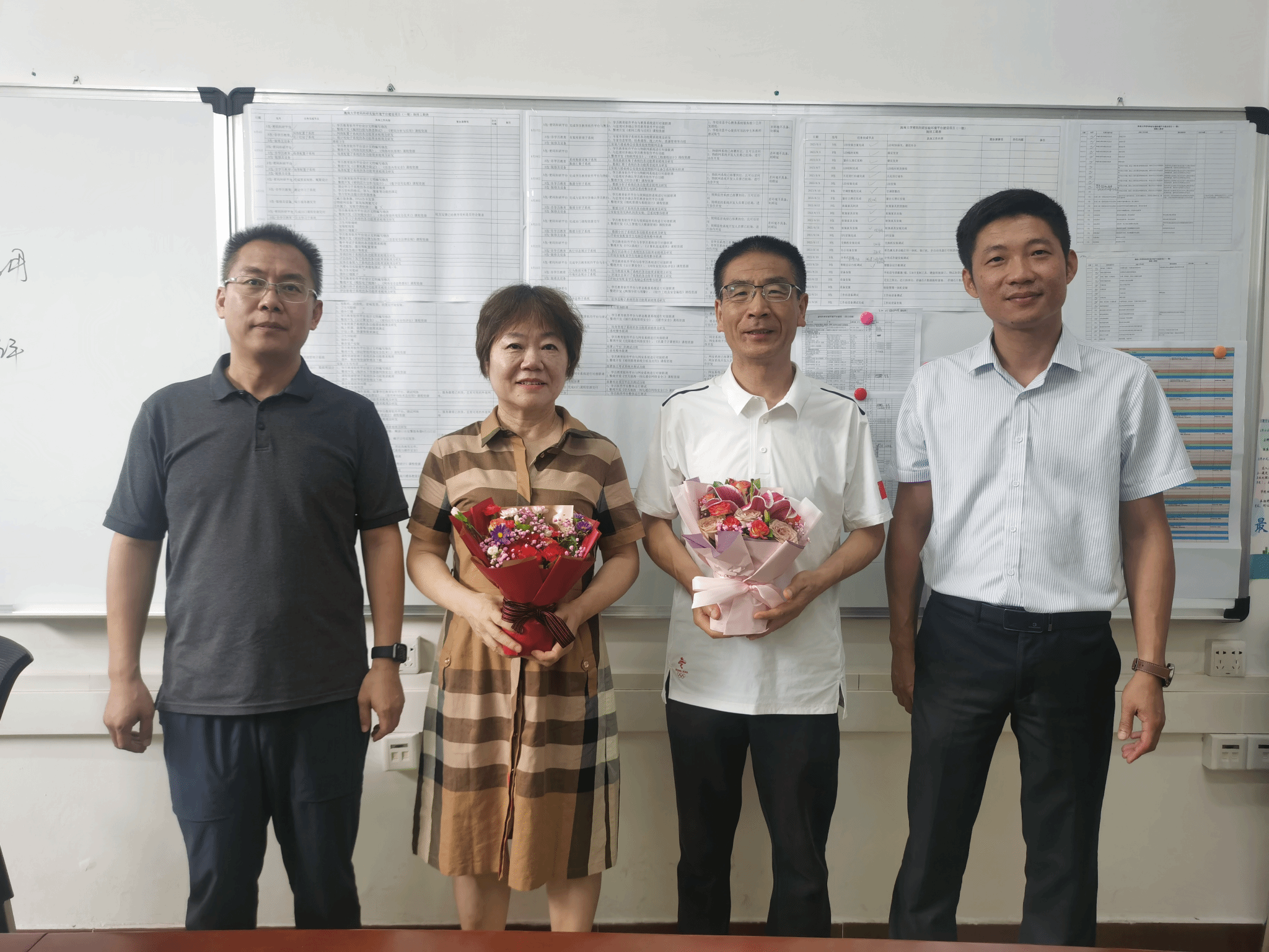 图2:执行经理曹春杰、党总支书记慰问从教30年教师代表(陈羡美高级实验师(左二)、张玉清教授(左三))